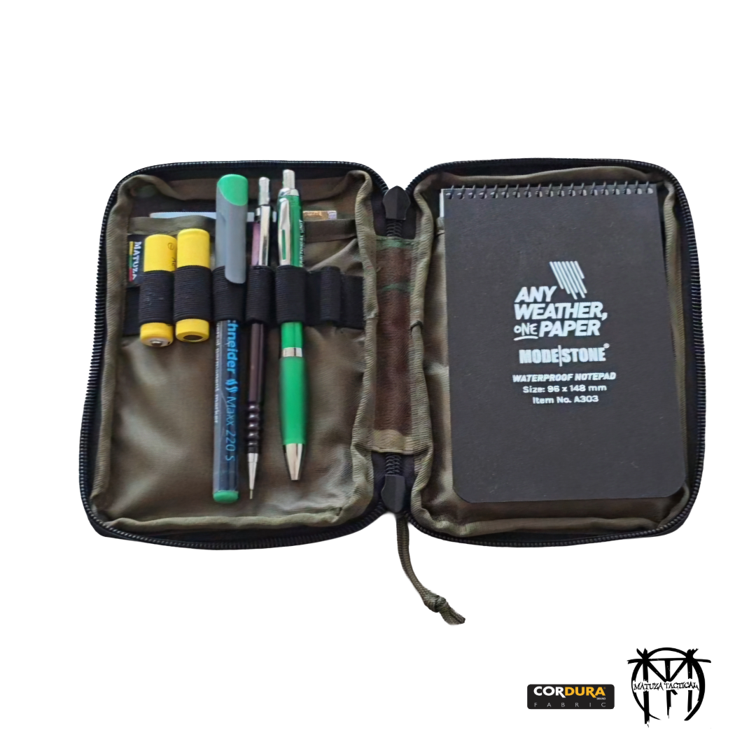 Užrašų knygutės dėklas skirtas Rite in the Rain 10×15 cm (4×6 colių) ar panašaus dydžio užrašų knygutėms. Dėkle taip galima nešioti rašymo priemones, atmintines ar kitas A6 formato dydžio korteles.